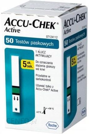 Accu-Chek Active test paskowy do pomiaru stężenia glukozy we krwi. Przydatne w samokontroli.Nanoszenie krwi na pasek testowy:opcja: test paskowy w glukometrze: włóż pasek do glukometru. Przy pomocy nakłuwacza nakłuj bok opuszki palca. W celu lepszego uformowania się kropli krwi rozmasuj palec w kierunku jego opuszki lekko uciskając. Nanieś kroplę na środek pomarańczowego pola i odsuń palec od testu paskowego. Wynik pomiaru powinien wyświetlić się na ekranie glukometru po kilku sekundach.opcja: test paskowy poza glukometrem – przy pomocy nakłuwacza nakłuj bok opuszki palca. W celu lepszego uformowania się kropli krwi rozmasuj palec w kierunku jego opuszki lekko uciskając. Nanieś kroplę na środek pomarańczowego pola i odsuń palec od testu paskowego. Wsuń test paskowy w kierunku pokazanym przez strzałki do prowadnicy. Test musi wyczuwalnie „zaskoczyć” na swoje miejsce. Wynik pomiaru powinien wyświetlić się na ekranie glukometru po kilku sekundach.