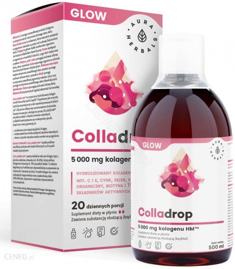 Suplement diety w płynie Colladrop Glow zawiera hydrolizowany kolagen morski typu I i III oraz 20 składników aktywnych. Preparat wzbogacony o witaminy, minerały, ekstrakty roślinne i składniki specjalne dla zdrowia włosów, skóry i paznokci.Colladrop Glow – kolagen morski[picture_1128116 width=”48″ height=”48″]Wegetariański[picture_1128117 alt=”Bez glutenu” width=”48″ height=”48″]Bez glutenu[picture_1128118 alt=”Bez laktozy” width=”48″ height=”48″]Bez laktozy[picture_1128119 alt=”Bez cukru” width=”48″ height=”48″]Bez dodatku cukru[picture_1128120 alt=”Bez soi” width=”48″ height=”48″]Bez soiSkładWielkość opakowania: 500 mlPorcja jednorazowa: 25 ml Ilość porcji w opakowaniu: 20Składniki 25 ml RWSHydrolizowany kolagen typu I i III 5000 mg Witamina C 100 mg 125%Witamina E 6 mg 50%Cynk 5 mg 50%Selen 27,5 µg 50%Krzem organiczny (MMST) 1 mg Kwas hialuronowy 60 mg Koenzym Q10 5 mg Cholina, w tym 1% krzemionki 20 mg0,2 mg Ekstrakt z pestek winogron DER 15:1, w tym 95% proantocyjanidynów (OPC) 7 mg6,65 mg Miedź 0,5 mg 50%MSM 300 mg Ekstrakt z pokrzywy DER 4:1 50 mg Ekstrakt z gotu koli DER 4:1 5 mg Tiamina (witamina B1) 1,1 mg 100%Ryboflawina (witamina B2) 1,4 mg 100%Niacyna (witamina B3) 16 mg 100%Kwas pantotenowy (witamina B5) 6 mg 100%Witamina B6 1,4 mg 100%Biotyna (witamina B7) 50 µg 100%Kwas foliowy (witamina B9) 200 µg 100%Witamina B12 2,5 µg 100%RWS – Dzienna referencyjna wartość spożycia Nie ustalono dziennej referencyjnej wartości spożyciaSkładniki:Woda destylowana, kolagen (Collagen HM™ – kolagen typu I i III), zagęszczony sok cytrynowy i pomarańczowy, substancja słodząca: ksylitol, metylosulfonylometan (MSM), kwas L-askorbinowy (witamina C), glukonian cynku (cynk), kwas hialuronowy, ekstrakt suchy z liści pokrzywy zwyczajnej DER 4:1, substancja konserwująca: sorbinian potasu, choliny (L) wodorowinian 1% (krzemionka), niacyna (witamina B3), ekstrakt z nasion winorośli właściwej (Vitis vinifera) DER 15:1 stand. na 95% proantocyjanidynów (OPC), pantotenian wapnia (kwas pantotenowy, witamina B5), D-alfa-tokoferol (witamina E), ekstrakt z gotu koli (wąkrotka azjatycka), koenzym Q10, cyjanokobalamina (witamina B12), ryboflawina (witamina B2), chlorowodorek pirydoksyny (witamina B6), tiamina (witamina B1), krzem organiczny (monometylosilanetriol), kwas foliowy (witamina B9), miedzi (II) D-glukonian (miedź), D-Biotyna (witamina B7), selenian (IV) sodu (selen).Sposób użycia:Przed użyciem mocno wstrząsnąć. Za pomocą miarki odmierzyć 25 ml i dodać do wody, soku lub innego chłodnego płynu.Zaleca się spożywanie preparatu przez okres min. 3 miesięcy.Przeciwwskazania:Nadwrażliwość na którykolwiek ze składników preparatu. W okresie ciąży i karmienia piersią przed zastosowaniem należy skonsultować się z lekarzem lub farmaceutą.Przechowywanie:Przechowywać w suchym miejscu, w temperaturze 15-25ºC, w sposób niedostępny dla małych dzieci.Ważne:Produkt nie może być stosowany jako substytut (zamiennik) prawidłowo zróżnicowanej diety. Zrównoważony sposób żywienia i prawidłowy tryb życia jest ważny dla funkcjonowania organizmu człowieka. Nie należy przekraczać maksymalnej zalecanej porcji do spożycia w ciągu dnia.ProducentAura Herbals Jarosław Paulul. 23 Marca 77/3, 81-820 Sopot