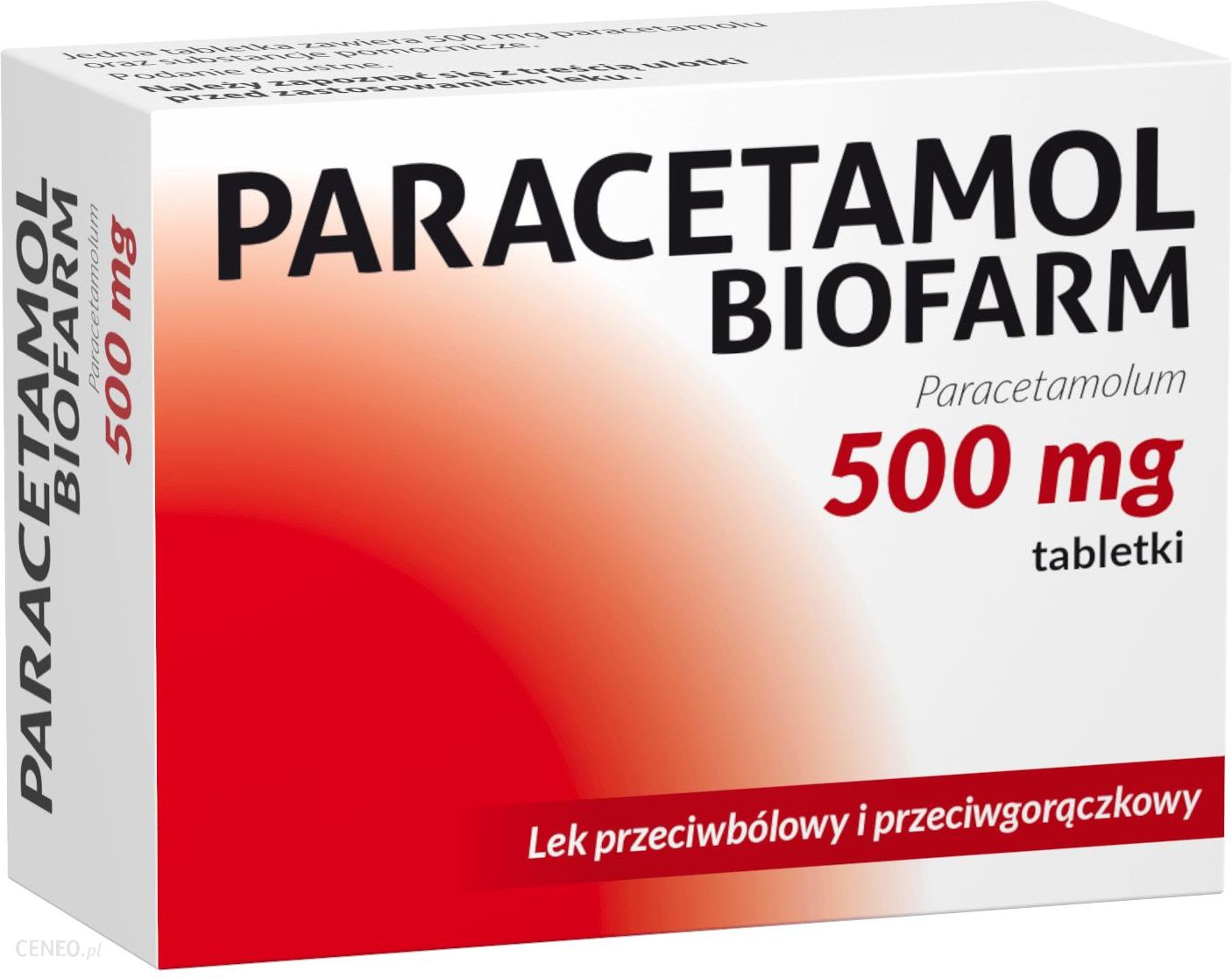 Biofarm Sp. z o.o.ul. Wałbrzyska 1360 -198 PoznańLek należy przechowywać w temperaturze pokojowej, w miejscu niewidocznym i niedostępnym dla dzieci.Lek Paracetamol Biofarm, jak każdy lek, może powodować działania niepożądane, jednak nie u każdego one wystąpią.Należy niezwłocznie przerwać przyjmowanie leku i skontaktować się z lekarzem, w przypadku wystąpienia:obrzęku naczynioruchowego czasem połączonego z utrudnionym oddychaniem lub opuchlizną warg, języka, gardła lub twarzy, trudnościami w oddychaniu, nadmiernego pocenie się, nudności, spadku ciśnienia krwi, wstrząsu, wstrząsu anafilaktycznego (występują bardzo rzadko, rzadziej niż u 1 na 10000 pacjentów),reakcji uczuleniowych, w tym wysypki skórnej, swędzenia, pokrzywki (występują rzadko: u 1 do 10 na 10 000 pacjentów),wysypki skórnej lub ciężkiej reakcji skórnej objawiającej się ostrą uogólnioną wysypką krostkową lub pęcherzami i nadżerkami na skórze, w jamie ustnej, oczach i narządach płciowych, gorączką i bólami stawowymi albo pękającymi olbrzymimi pęcherzami podnaskórkowymi, rozległymi nadżerkami na skórze, złuszczaniem się dużych płatów naskórka i gorączką (występują bardzo rzadko),problemów z oddychaniem, w szczególności w przypadku, gdy podobne problemy występowały w przeszłości podczas stosowania kwasu acetylosalicylowego lub innych niesteroidowych leków przeciwzapalnych (występują bardzo rzadko),sińców lub krwawienia spowodowanego trombocytopenią, zaburzeniami płytek krwi, plamicą małopłytkową lub niedokrwistością hemolityczną (występują rzadko),skłonności do zakażeń i ogólnego osłabienia spowodowanego przez agranulocytozę, (występują rzadko) lub pancytopenię (występują bardzo rzadko),zaburzenia czynności wątroby, uszkodzenia wątroby, żółtaczki, martwicy wątroby(występują rzadko), hepatotoksyczność (występują bardzo rzadko),przedawkowania i zatrucia (występują rzadko),niskiego poziomu cukru we krwi (występuje bardzo rzadko),ropomoczu, ciężkiego uszkodzenie nerek, śródmiąższowego zapalenie nerek, krwi w moczu, niemożność oddania moczu (występują bardzo rzadko).Rzadko (1 do 10 na 10 000 pacjentów):zaburzenia krwi w tym leukopenia i zaburzenia czynności szpiku kostnego,drżenie, ból głowy,depresja, dezorientacja, halucynacje,zaburzenia widzenia,zawroty głowy, złe samopoczucie, gorączka, senność, interakcje z innymi lekami,obrzęk,ból brzucha, krwawienia z żołądka lub jelit, biegunka, nudności, wymioty,pocenie się,plamica.Częstość nieznana (nie może być określona na podstawie dostępnych danych):choroby skóry wywołane przez paracetamol.Lek Paracetamol Biofarm należy stosować dokładnie tak, jak opisano w ulotce dla pacjenta lub według wskazań lekarza i/lub farmaceuty.Dorośli i młodzież od 12 lat: 1-2 tabletki dziennie, co odpowiada (500-1000 mg paracetamolu.W razie konieczności dawkę można powtórzyć jednak nie częściej niż co 4 godziny, do 4 razy na dobę.Maksymalna dawka dobowa to 8 tabletek (4000 mg paracetamolu).Dzieci od 6 do 12 lat: 0,5-1 tabletka dziennie (nie więcej niż 10-15 mg paracetamolu/kg masy ciała).W razie konieczności dawkę można powtarzać jednak nie częściej niż co 4 godziny, maksymalnie 4 razy na dobę.Maksymalna dawka dobowa paracetamolu to 60 mg paracetamolu/kg masy ciała/dobę, podawana w dawkach podzielonych.Tabletkę należy połknąć, popijając niewielką ilością płynu (najlepiej przegotowanej wody).Tabletkę można podzielić na dwie równe dawki.Przyjmowanie leku podczas posiłku może opóźnić czas rozpoczęcia jego działania.Leku nie należy stosować dłużej niż przez 3 dni bez konsultacji z lekarzem. Jeżeli po upływie 3 dni nie nastąpiła poprawa lub pacjent czuje się gorzej, należy zwrócić się do lekarza. Nie stosować dawki większej niż zalecana ani stosować dawki podwójnej w celu uzupełnienia pominiętej dawki.Paracetamol Biofarm jest lekiem, którego substancja czynna posiada działanie przeciwbólowe i przeciwgorączkowe. Paracetamol stosowany jest w leczeniu bólu różnego pochodzenia o natężeniu łagodnym do umiarkowanego, w tym bólu głowy, migreny, bólu reumatycznego, bólu mięśni, stawów i kości, bólu kręgosłupa, nerwobólu, bólu menstruacyjnego, bólu zęba jak również gorączki, w tym w przebiegu przeziębienia i grypy. Stosowanie paracetamolu nie powoduje podrażnienia żołądka.Przeciwbólowe i przeciwgorączkowe.Przed użyciem zapoznaj się z ulotką, która zawiera wskazania, przeciwwskazania, dane dotyczące działań niepożądanych, dawkowanie oraz informacje dotyczące stosowania produktu leczniczego bądź skonsultuj się z lekarzem lub farmaceutą, gdyż każdy lek niewłaściwie stosowany zagraża Twojemu życiu lub zdrowiu.1 tabletka zawiera:substancję czynną: paracetamol 500mg,pozostałe składniki: skrobia żelowana kukurydziana, powidon K30, krospowidon A, kroskarmeloza sodowa, celuloza mikrokrystaliczna, kwas stearynowy 50, magnezu stearynian.Leczenie bólu o nasileniu łagodnym do umiarkowanego, w tym bóle głowy, migreny, bóle stawowe, mięśniowe i kostne, bóle reumatyczne, bóle kręgosłupa, nerwobóle, bóle zębów, bóle.Gorączka, w tym w przebiegu przeziębienia i/lub grypy.Leku nie należy podawać dzieciom w wieku od 3 miesięcy do 6 lat (dla tej grupy pacjentów są dostępne leki zawierające paracetamol w postaci farmaceutycznej przeznaczonej do stosowania u dzieci).Leku Paracetamol Biofarm nie należy stosować jednocześnie z innymi lekami zawierającymi paracetamol z uwagi na ryzyko przedawkowania i ciężkich działań niepożądanych.Należy unikać częstego stosowania leków zawierających paracetamol.Nie należy przekraczać maksymalnej dawki dobowej paracetamolu, gdyż przyjmowanie leku w większych niż zalecane dawkach może powodować ciężkie uszkodzenie wątroby.Rozpoczęcie stosowania leku należy skonsultować z le