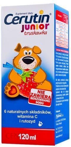 CERUTIN JUNIOR syrop o smaku truskawkowym 120 mlCerutin® Junior truskawka to pyszny suplement diety o smaku truskawkowym, zawierający bogatą kompozycję starannie dobranych składników aktywnych. Zawiera 6 naturalnych składników, witaminę C i rutozydBez dodatku benzoesanu soduWłaściwościWitamina C – pomaga w prawidłowym funkcjonowaniu układu odpornościowego, przyczynia się do zmniejszenia uczucia zmęczenia i znużeniaAronia – pomaga chronić komórki przed wolnymi rodnikami spowodowanymi stresem oksydacyjnymCzarna porzeczka – korzystna dla prawidłowego funkcjonowania mięśni i stawów/na elastyczność stawówDzika róża – wspomaga naturalną ochronę organizmu oraz system odpornościowyAloes – stymuluje metabolizm, pomaga w utrzymaniu prawidłowych funkcji skóry i warstwy naskórkaCzarny bez – korzystny dla prawidłowego funkcjonowania układu oddechowego, przyczynia się do utrzymania dobrego fizycznego samopoczuciaPolecany w szczególności w okresie jesienno-zimowym, przesilenia wiosennego oraz w okresie rekonwalescencjiZalecane spożycieDzieci powyżej 3. roku życia i dorośli: 10 ml produktu (2 łyżeczki do herbaty lub 1 łyżka deserowa) 3 razy dzienniePrzed użyciem wstrząsnąćProdukt zawiera ekstrakty roślinne, które mogą powodować niewielkie zmętnie­nie, co w żaden sposób nie wpływa na jakość i skuteczność produktuSkładnikiWoda, sacharoza, zagęszczony sok aroniowy, glukonian wapnia, wyciąg z owoców czarnej porzeczki, wyciąg z owoców truskawki, wyciąg z owoców dzikiej róży, L-askorbinian potasu, wyciąg z owoców czarnego bzu, substancja konserwująca – sorbinian potasu, regulator kwasowości – kwas cytrynowy, aromat truskawkowy, wyciąg z liści aloesu, substancja zagęszczająca – guma ksantanowa, rutozydSkładniki30 mlZalecane Dzienne SpożycieZagęszczony sok aroniowy900 mgnie ustalonoWyciągi z owoców:nie ustalonoczarnej porzeczki300 mgnie ustalonotruskawki300 mgnie ustalonodzikiej róży90 mgnie ustalonoczarnego bzu60 mgnie ustalonoWitamina C60 mg75 %*Wyciąg z liści aloesu30 mgnie ustalonoRutozyd15 mgnie ustalono* zalecane dzienne spożycie