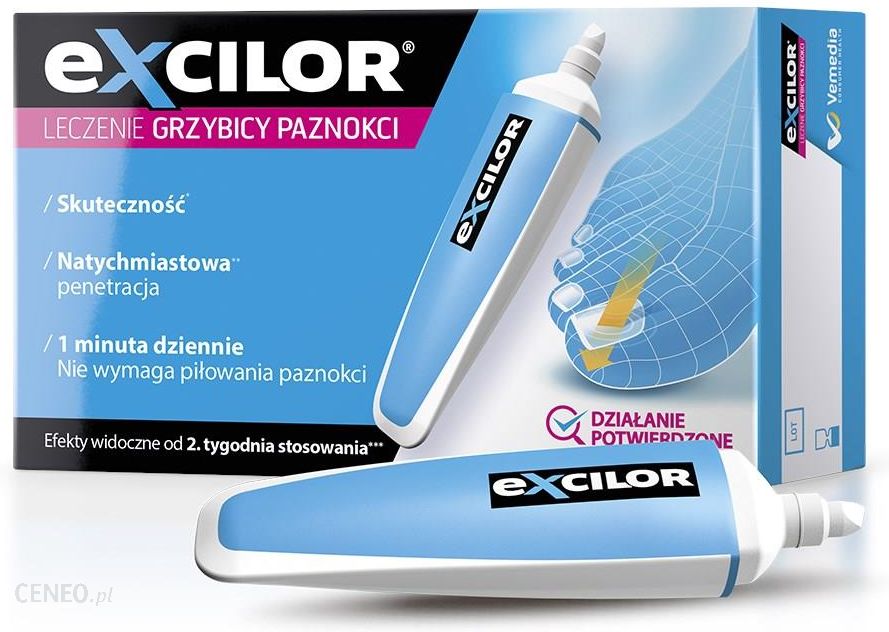 Opis: Excilor® leczenie grzybicy paznokci w formie sztyftu to wyrób medyczny stosowany w leczeniu grzybicy paznokci. Jako jeden z niewielu na rynku, dzięki technologii TransActive, nie wymaga uciążliwego piłowania paznokcia. Wnika w głąb paznokcia na całej powierzchni, natychmiast obniża pH paznokcia, tworząc niekorzystne środowisko dla rozwoju grzybów. Produkt wzbogacony jest w glicerol, lipidy pielęgnujące paznokcie oraz biotynę, które pomagają odbudować uszkodzoną strukturę paznokcia, co wpływa korzystnie na estetyczny wygląd paznokcia. Efekty widoczne już od 2. tygodnia stosowania.¹Wygodny – aplikacja zajmuje tylko 1 min. dziennie rano i wieczorem. Skuteczność preparatu Excilor® na poziomie amorolfiny, potwierdzona w badaniach klinicznych.² Excilor. Doskonałość w leczeniu i pielęgnacji stóp.