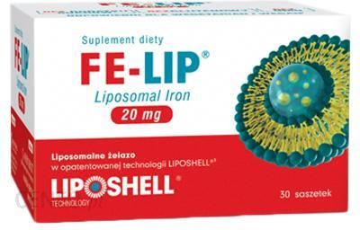 Fe-Lip Liposomalne żelazo 20 mg – 30 sasz.Wskazania:Fe-Lip Liposomalne żelazo 20 mg to suplement wskazany do stosowania w celu uzupełnienia niedoboru żelaza w diecie dzieci (od 1. roku życia), młodzieży i osób dorosłych. Wskazany szczególnie w okresie wzrostu, w zwiększonym zapotrzebowaniu na żelazo.Właściwości:Preparat FE-LIP to suplement diety zawierający żelazo wolne (niezamknięte w liposomach) – podobnie, jak inne preparaty w formie tradycyjnej oraz żelazo zamknięte w liposomach. Pozwala na wchłanianie żelaza dwoma niezależnymi drogami transportu:do układu krwionośnego – ten mechanizm wchłaniania wykorzystywany jest w przypadku innych, dostępnych na rynku tradycyjnych preparatów żelaza, do układu limfatycznego – ten mechanizm wchłaniania żelaza jest możliwy tylko w przypadku preparatów liposomalnych.Żelazo jest niezbędnym mikroelementem i pełni wiele istotnych funkcji w organizmie,przyczynia się do prawidłowego transportu tlenu w organizmie,pomaga w prawidłowej produkcji czerwonych krwinek i hemoglobiny, żelazo wpływa na prawidłowe funkcjonowanie układu odpornościowego,przyczynia się do prawidłowego utrzymania metabolizmu energetycznego,wykazuje pozytywny wpływ na układ nerwowy, funkcjonowanie fizyczne i intelektualne człowieka,przyczynia się m.in do: utrzymania prawidłowych funkcji poznawczych, także u dzieci, zmniejszenia uczucia zmęczenia i znużenia,odgrywa rolę w procesie podziału komórek.Składniki:1 saszetka dostarcza 7 mg żelaza.Stosowanie:Małe dzieci, dzieci i młodzież – 1 saszetka dziennie.Dziewczęta w wieku 10 do 18 lat po wystąpieniu pierwszej miesiączki – 2 saszetki dziennie.FE-LIP 7 mg można spożyć bezpośrednio lub rozpuścić w niewielkiej ilości wody niegazowanej i wypić, można stosować podczas posiłków.Ważne informacje:Nie stosować w przypadku nadwrażliwości na którykolwiek składnik preparatu.Opakowanie:30 saszetekSuplementy diety nie mogą być stosowane jako substytut (zamiennik) zróżnicowanej diety ani zdrowego trybu życia. Nie należy przekraczać zalecanej porcji produktu do spożycia w ciągu dnia. Suplementy diety powinny być przechowywane w sposób niedostępny dla małych dzieci. Przed zastosowaniem produktu sugerujemy zapoznanie się z dokładnymi informacjami podanymi na opakowaniu lub załączonej ulotce.
