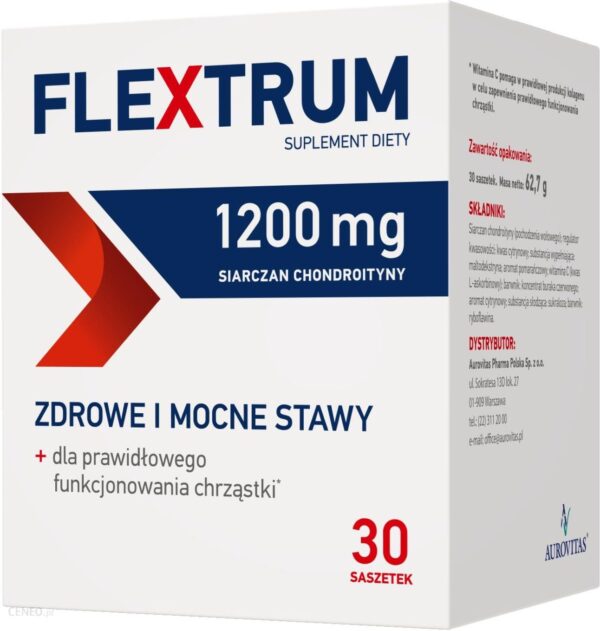 Suplement diety FLEXTRUM 1200 mg zawiera witaminę C oraz siarczan chondroityny, które pomagają w prawidłowej produkcji kolagenu celem zapewnienia prawidłowego funkcjonowania chrząstki. Zawiera substancję słodzącą. Jest wolny od glutenu i laktozy.Zastosowanie: suplementacja diety w składniki aktywne preparatu.Zalecane spożycie: zaleca się stosować 1 saszetkę dziennie. Rozpuść 1 saszetkę w szklance (200ml) chłodnej wody, intensywnie mieszając.Składniki: siarczan chondroityny; regulator kwasowości: kwas cytrynowy; substancja wypełniająca: maltodekstryna; aromat pomarańczowy; witamina C (kwas L-askorbinowy); barwnik: koncentrat buraka czerwonego; aromat cytrynowy; substancja słodząca: sukraloza; barwnik: ryboflawina1 saszetka zawiera: siarczan chondroityny 1200mg, witamina C 40mg (50%)**RWS- referencyjna wartość spożyciaPrzeciwwskazania: nie należy stosować w ciąży i w okresie karmienia piersią.Ważne wskazówki:Nie należy przekraczać zalecanej dziennej porcji.Zrównoważony sposób żywienia i prawidłowy tryb życia jest ważny dla funkcjonowania organizmu człowieka.Suplement diety nie może być stosowany jako substytut (zamiennik) zróżnicowanej diety.Suplement diety powinien być przechowywany w sposób niedostępny dla małych dzieci.Preparat należy przechowywać w temperaturze pokojowej, w suchym miejscu.Producent:Apotex Polska Sp. z o.o.,ul. Ostrobramska 95,04-118 Warszawa.