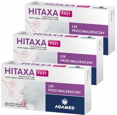 Informacja o lekuNazwa:Hitaxa Fast. Lek przeciwalergiczny.Nazwa powszechnie stosowana substancji czynnej:Desloratadinum.Dawka substancji czynnej lub stężenie substancji czynnej:Każda tabletka ulegająca rozpadowi w jamie ustnej zawiera 5 mg desloratadyny.Postać farmaceutyczna:Tabletka ulegająca rozpadowi w jamie ustnej.Wskazania do stosowania:Produkt Hitaxa Fast jest wskazany w celu łagodzenia objawów związanych z: alergicznym zapaleniem błony śluzowej nosa lub pokrzywką.Przeciwwskazania:Nadwrażliwość na substancję czynną lub na którąkolwiek substancję pomocniczą lub na loratadynę.Opakowanie:10 tabletek ulegających rozpadowi w jamie ustnej.Podmiot odpowiedzialny:Adamed Pharma S.A.Pieńków, ul. Mariana Adamkiewicza 6A05-152 Czosnów k. W-wy