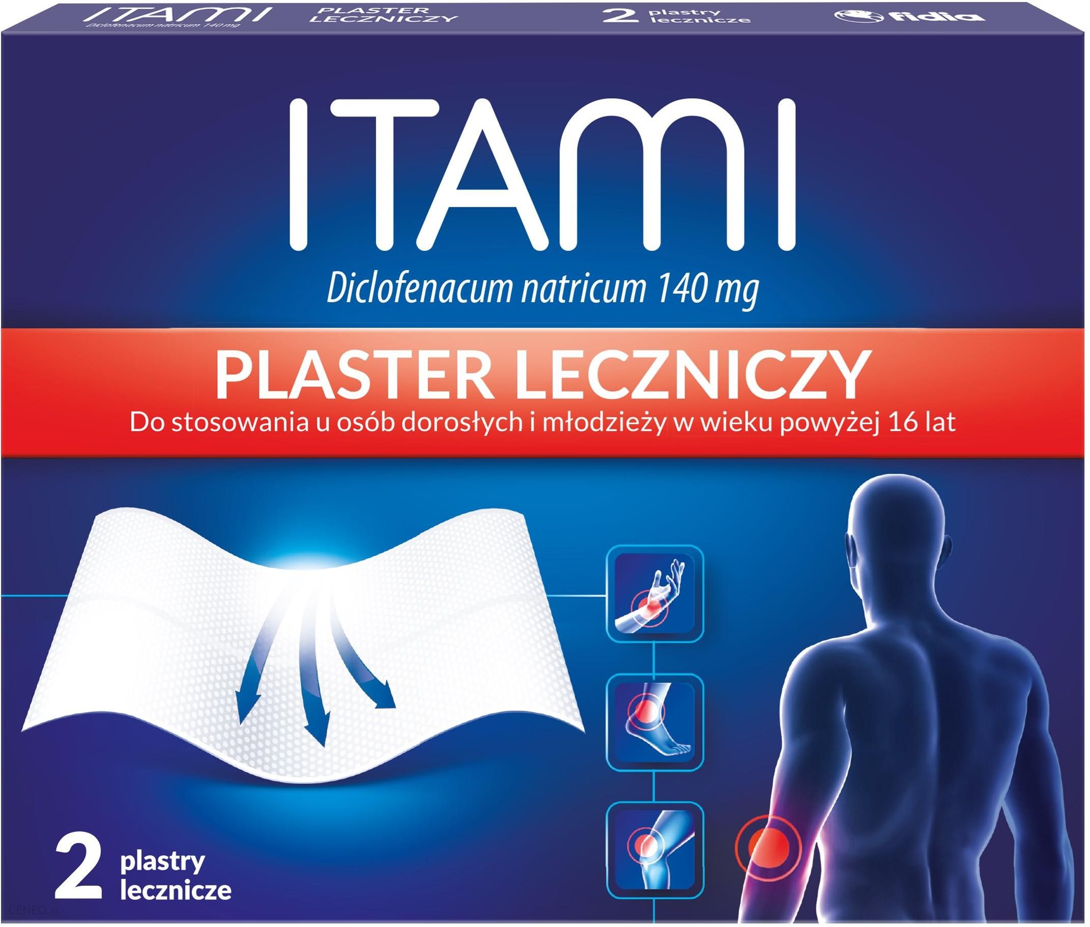 ITAMI Plaster leczniczy z diklofenakiemDzięki skutecznemu działaniu przeciwbólowemu, przeciwzapalnemu i przeciwobrzękowemu oraz wygodnej formie podania (trwale przylegający, cienki i elastyczny plaster) lek ITAMI reprezentuje nowoczesne podejście do leczenia miejscowego bólu ostrego np. bólu pourazowego.Co to jest ITAMI?ITAMI to preparat w postaci plastra leczniczego zawierający diklofenak (140 mg). Jest przeznaczony do stosowania w miejscu występowania bólu i stanu zapalnego.ITAMI wykazuje skuteczne działanie:przeciwbóloweprzeciwzapalneprzeciwobrzękoweBól pourazowy:Kontuzje i urazy często zdarzają się podczas aktywnego spędzania czasu. W większości sytuacji są to niegroźne urazy, którym towarzyszą siniaki i stłuczenia. Niekiedy jednak dochodzi do poważniejszych uszkodzeń, tj. wystąpienia złamań lub zwichnięć. W każdym z powyższych przypadków szybka reakcja pozwoli nam uniknąć bólu i ryzyka wystąpienia powikłań.