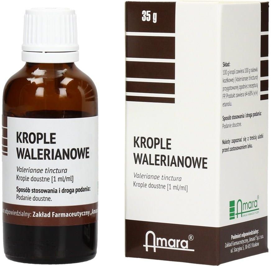 KROPLE WALERIANOWEVALERIANAE TINCTURAZASTOSOWANIELek Krople walerianowe zawiera nalewkę kozłkową przygotowaną zgodnie z recepturą zamieszczoną w Farmakopei Polskiej. Lek ma działanie uspokajające.WSKAZANIALek Krople walerianowe stosowany jest w celu złagodzenia objawów wywołanych stanami napięcia nerwowego oraz jako środek ułatwiający zasypianie.Jeśli objawy nie ustępują podczas stosowania leku lub pacjent czuje się gorzej, należy poradzić się lekarza.DZIAŁANIEProdukt stosowany w celu złagodzenia objawów wywołanych stanami napięcia nerwowego oraz jako środek ułatwiający zasypianie.SKŁADCo zawiera lek Krople walerianoweSubstancją czynną leku jest nalewka kozłkowa.100 g kropli zawiera 100 g nalewki kozłkowej (Valerianae tinctura) przygotowanej zgodnie z recepturą Farmakopei Polskiej z korzenia kozłka lekarskiego, etanolu i wody.Produkt zawiera 64 – 68% (v/v) etanolu.SPOSÓB UŻYCIALek Krople walerianowe należy zawsze przyjmować dokładnie tak, jak to opisano w tej ulotce dla pacjenta, lub według zaleceń lekarza, farmaceuty lub pielęgniarki. W razie wątpliwości należy zwrócić się do lekarza, farmaceuty lub pielęgniarki.Produkt leczniczy do podania doustnego.Zalecane dawkowanie:Dorośli, młodzież w wieku powyżej 12 lat i osoby w podeszłym wieku:– w objawach napięcia nerwowego: przyjmować 3 razy na dobę po ok. 65 kropli (ok. 2,10 ml), co odpowiada pół łyżeczki płynu, rozcieńczyć w ¼ szklanki wody;– jako środek ułatwiający zasypianie: ok. 65 kropli (ok. 2,10 ml), co odpowiada pół łyżeczki płynu, rozcieńczyć w ¼ szklanki wody, przyjmować ok. pół godziny przed snem, można przyjąć dodatkową dawkę wieczorem jeśli konieczne.Maksymalna dawka dobowa wynosi 4 dawki pojedyncze leku (4 razy po pół łyżeczki płynu).Jeśli dolegliwości nasilają się lub utrzymują podczas stosowania leku, należy skonsultować się z lekarzem.Jeśli do opakowania dołączony jest dozownik strzykawkowy o pojemności 5 ml, z podziałką co 0,1 ml należy go użyć do odmierzenia właściwej dawki leku.W celu odmierzenia dawki leku dozownikiem strzykawkowym należy:– odkręcić zakrętkę i odłożyć ją w bezpieczne miejsce– zanurzyć koniec dozownika strzykawkowego w kroplach doustnych– odciągnąć tłok dozownika strzykawkowego, nabierając odpowiednią dawkę leku– wyjąć dozownik strzykawkowy i zamknąć butelkę.Jeśli po nabraniu roztworu we wnętrzu dozownika strzykawkowego widoczne są pęcherzyki powietrza, dozownik strzykawkowy należy odwrócić końcówką do góry. Powietrze przemieści się ku górze. Pociągnąć tłok, a następnie delikatnie go nacisnąć w celu usunięcia pęcherzyków powietrza.Przyjęcie większej niż zalecana dawki leku Krople walerianoweKorzeń waleriany w dawce 20 g, co odpowiada w przybliżeniu 100 g produktu (1 duża butelka lub 2-3 mniejsze), może powodować uczucie zmęczenia, skurczowy ból brzucha, uczucie ucisku w klatce piersiowej, drżenie rąk, zawroty głowy, nudności, biegunkę, które zwykle zanikają po 24 h.Na objawy przedawkowania może mieć wpływ również alkohol zawarty w leku.W przypadku znacznego przedawkowania leku należy skonsultować się z lekarzem.Pominięcie przyjęcia leku Krople walerianoweNie należy stosować dawki podwójnej w celu uzupełnienia pominiętej dawki.Przerwanie przyjmowania leku Krople walerianoweW razie jakichkolwiek dalszych wątpliwości związanych ze stosowaniem tego leku należy zwrócić się do lekarza, farmaceuty lub pielęgniarki.PRZECIWWSKAZANIANie należy stosować leku u pacjentów z nadwrażliwością na korzeń kozłka (walerianę). Produkt szkodliwy dla osób z chorobą alkoholową. Nie zaleca się stosowania u dzieci do 12 roku życia i osób z grup wysokiego ryzyka, takich jak pacjenci z chorobą wątroby i padaczką.OSTRZEŻENIAPrzed rozpoczęciem przyjmowania leku Krople walerianowe należy omówić to z lekarzem, farmaceutą lub pielęgniarką.Dawka stosowana jednorazowo (ok. 65 kropli (2,10 ml) co odpowiada pół łyżeczki płynu) zawiera 1,0 g etanolu, co odpowiada 25,4 ml piwa i ok. 10,6 ml wina.Szkodliwe dla osób z chorobą alkoholową. Nie zaleca się stosowania u dzieci i osób z grup wysokiego ryzyka, takich jak pacjenci z chorobą wątroby i padaczką.Dzieci:Nie zaleca się stosowania u dzieci w wieku poniżej 12 lat.Lek Krople walerianowe a inne leki:Należy powiedzieć lekarzowi lub farmaceucie o wszystkich lekach przyjmowanych przez pacjenta obecnie lub ostatnio, a także o lekach, które pacjent planuje przyjmować.Dostępna jest tylko niewielka ilość danych dotyczących interakcji pomiędzy produktem Krople walerianowe a innymi produktami leczniczymi. Nie obserwowano klinicznie istotnych interakcji z innymi lekami.Nie zaleca się stosowania leku Krople walerianowe z syntetycznymi lekami uspokajającymi.Ciąża, karmienie piersią i wpływ na płodność:Jeśli pacjentka jest w ciąży lub karmi piersią, przypuszcza że może być w ciąży lub gdy planuje mieć dziecko, powinna poradzić się lekarza lub farmaceuty przed zastosowaniem tego leku.Ze względu na brak danych dotyczących bezpieczeństwa stosowania produktu, nie zaleca się przyjmowania w okresie ciąży i karmienia piersią.Prowadzenie pojazdów i obsługiwanie maszyn:Ze względu na zawartość etanolu oraz działanie uspokajające preparat, zwłaszcza przyjęty w dawce większej niż zalecana, może ograniczać zdolność prowadzenia pojazdów mechanicznych i obsługi maszyn. Wrażliwi pacjenci nie powinni prowadzić pojazdów i obsługiwać maszyn po przyjęciu leku.DZIAŁANIA NIEPOŻĄDANEJak każdy lek, lek Krople walerianowe może powodować działania niepożądane, chociaż nie u każdego one wystąpią.Na skutek przyjmowania leku mogą wystąpić objawy żołądkowo-jelitowe (np. nudności, skurczowe bóle brzucha). Częstość występowania tych objawów niepożądanych nie jest znana.Zgłaszanie działań niepożądany
