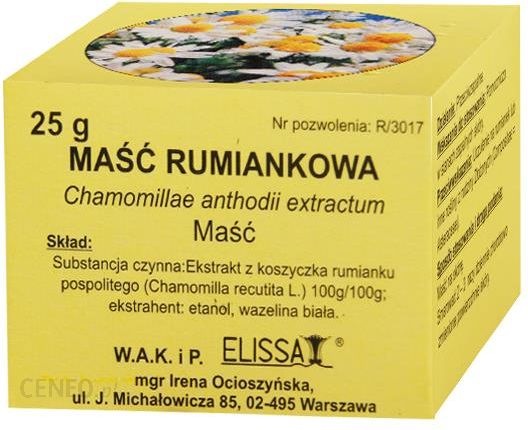 Skład:Substancja czynna: ekstrakt z koszyczka rumianku pospolitego (Chamomilla recutita L.) 100g/100g;ekstrahent: etanol, wazelina biała.Działanie: Przeciwzapalne.Wskazania do stosowania:Pomocniczo w stanach zapalnych skóry.Przeciwwskazania: Uczulenie na rumianek lub inne rośliny z rodziny Złożonych (Compositae = Asteraceae).Sposób stosowania i droga podania:Maść na skórę.Smarować 2 – 3 razy dziennie chorobowo zmienione powierzchnie skóry.Działania niepożądane:Mogą wystąpić odczyny alergiczne skóry (np. alergia kontaktowa).Środki ostrożności związane ze stosowaniem:Nie stosować u niemowląt. Ostrożnie stosować u małych dzieci.