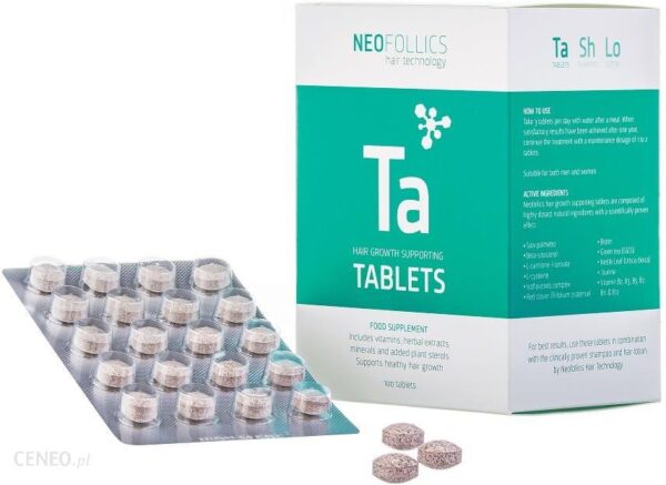Suplement diety Neofollics przeciw wypadaniu włosów może być stosowany z powodzeniem przez kobiety i mężczyzn.Tabletki zawierają naturalne ekstrakty roślinne które wpływają na zmniejszenie konwersji testosteronu do DHT (dwuhydrotestosteronu) odpowiedzialnego za miniaturyzację mieszków włosów i w konsekwencji do wypadania włosów.Ekstrakt z palmy sabałowej (saw palmetto), beta-sitosterol, ekstrakt z pokrzywy wpływają na redukcją poziomu DHT.IzoflawonyEkstrakt z czerwonej koniczyny zawiera wysokie stężenie izoflawonów, które wpływają na zmniejszenie poziomu DHT w mieszkach włosów. Izofalawony przywracają również równowagę hormonalnąPolifenolePolifenol z zielonej herbaty EGCG nie tylko jest silnym antyoksydantem ale pobudza również wzrost włosów i jest inhibitorem DHT.Aminokwasy egzogenne, minerały i witaminyTabletki Neofollics zawierają również wiele aminokwasów, minerałów i witamin niezbędnych dla prawidłowego wzrostu włosów. W składzie suplementu Neofollics są trzy ważne aminokwasy: L-karnityna-l-tartrate, L-cysteina i tauryna. Wpływają one na poprawę transportu składników odżywczych do korzenia włosa i zwiększają one produkcję energii.Selen i cynk są niezbędne dla utrzymania zdrowych włosów.Kwas foliowy chroni DNA i wpływa na podział komórek. Wspiera wzrost tkanek w organizmie a tym samym włosów.Biotyna to ważna witamina dla włosów. Niedobór biotyny może prowadzić do łysienia i pogorszenia stanu skóry i paznokci.Pozostałe witaminy: B2, B3, B5, B7, B11 i B12 są również istotnie z punktu widzenia zdrowia skóry głowy i włosów.Składnik aktywnyIlość w porcji% zapotrzebowanieSterole roślinne (Beta-sitosterol) 190 mg *Ekstrakt z zielonej herbaty 80% (EGCG) 167 mg *Ekstrak z palmy sabałowej 160 mg *Ekstrakt z czerwonej koniczyny (11% isoflavones) 90 mg *Ekstrakt z liści pokrzywy 75 mg (equivalent) *Kompleks izoflawonów 100 mg *Tauryna 100 mg *L-karynityna 68 mg *L-cysteina 45 mg *Witamina B2 (Riboflavin) 1,4 mg 100%Witamina B3 (Niacin) 40 mg 250%Witamina B5 (Pantothenate) 30 mg 500%Biotyna 1000 µg 2000%Kwas foliowy 150 µg 75%Witamina B12 (Cyanocobalamin) 1,5 µg 50%Selen 55 µg 100%Cynk 15 mg 150%RezultatyKuracja zaczyna działać już od pierwszego dnia stosowania ale widoczne wyniki pojawiają się później. Po kilku tygodniach powinna nastąpić poprawa w zakresie wypadania włosów. Z każdym miesiącem włosy staną się mocniejsze i będą odrastać grubsze. Może potrwać to od 3-6 miesięcy.Stosowanie1-3 tabletek dziennie podczas lub po posiłku. W celu osiągnięcia najlepszych rezultatów zaleca się stosować 3 tabletki dziennie przez okres 12 miesięcy. Po tym czasie można stosować dawkę podtrzymującą w dawce 1-2 tabletek dziennie.Tabletki odpowiednie dla mężczyzn i kobiet. Łatwe to połknięcia (1cm średnicy).Opakowanie zawiera 100 tabletek.SkładBulking agents (Microcrystalline cellulose, Calcium hydrogen phosphate), Sitosterol plant sterol (contains soy), Green tea (Camellia sinensis) extract 80% (contains caffeine), Saw palmetto (Serenoa repens) extract, Anticaking agents (Sodium starch glycolate, Stearic acid, Colloidal silicon dioxide, Talc), Isoflavone complex, Taurine, L-carnitine-l-tartrate, Red clover (Trifolium pratense) extract, L-cysteine HCl, Zinc citrate, Nicotinic acid, Calcium-d-pantothenate, Nettle leaf (Urtica dioica herba) extract, Riboflavin, Biotin, Folic acid, Sodium selenite, Cyanocobalamin.
