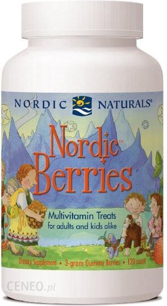 Smaczne multiwitaminowe żelki dostarczają niezbędnych witamin i minerałów, których potrzebuje każde dziecko gdy rośnie. Żelki Nordic Berries wspierają rozwój dziecka we wczesnych latach i utrzymanie go w późniejszym wieku. Mają wyraźny słodko-kwaśny smak skandynawskiej maliny moroszki i dostarczają składników najwyższej jakości, podobnie jak inne suplementy od Nordic Naturals. Są wspaniałym towarzyszem dla naszych produktów premium na bazie kwasów omega-3 dla dzieci i dorosłych.Dostarczają niezbędnych dla rosnącego dziecka witamin i minerałów takich jak: cynk i witaminy A, B, C, D3 i E. Łatwe do żucia, na bazie pektyn. Wspaniały, słodko-kwaśny, cytrusowy smak.Wskazania: dla dzieci od drugiego roku życia i dorosłych. Dostarczenie niezbędnych dla rosnącego dziecka witamin i minerałów takich jak: cynk i witaminy A, B, C, D3 i E.Dawkowanie: dzieci powyżej 2 roku życia: 4 żelki do żucia. Najlepiej zażywać w trakcie posiłku, lub stosować zgodnie z zaleceniami lekarza lub farmaceuty. Nie należy przekraczać zalecanego dziennego spożycia.Skład: 4 żelki zawierają: witamina A (beta-karoten) 750mcg, witamina C (kwas akorbinowy) 40mg, wapń (cytrynian wapnia) 20mg, witamina D3 (cholekacyferol) 10mcg, witamina E (d-alfa tokeferol) 6,67mg, tiamina (monoazotan tiaminy) 0,7mg, ryboflawina (witamina B2)0,85mg, witamina B6 (pirydoksyna HCL) 1mg, witamina B12 (cyjanokobalamina) 3mcg, kwas foliowy 0,1mg, biotyna 0,15mg, kwas pantotenowy (d-pantotenian wapnia) 2,5mcg, jod (jodek potasu) 35mcg, magnez (cytrynian magnezu) 5mg, cynk (cytrynian cynku) 8mg, cholina (dwuwinian choliny) 10mcg, inozytol 10mcg oraz substancje pomocnicze.Wolne od alergenów pochodzących z mleka, jaj, ryb, skorupiaków, orzechów, pszenicy, orzeszków ziemnych i soi.Bez sztucznych barwników, aromatów i konserwantów.Nie zawiera glutenu.