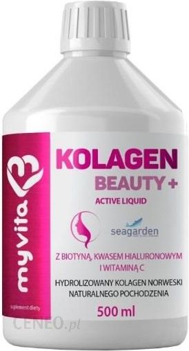 Nazwa produktu:MyVita Kolagen Beauty, 500 mlRodzaj produktu:suplement dietyOpis produktu:Kolagen znajdujący się w produkcie MyVita to doskonałej jakości kolagen hydrolizowany wytwarzany z dorsza dziko żyjącego w czystych wodach północnego Atlantyku. Przetwarzaniem surowca, w specjalnym procesie zapewniającym zachowanie wszystkich wartości odżywczych, zajmuje się norweska firma SeaGarden. Kolagen hydrolizowany to doskonała forma kolagenu, ponieważ taki surowiec wykazuje doskonałą stabilność i przyswajalność. Wszystkie surowce pochodzenia rybiego posiadają certyfikat zrównoważonych połowów (MSC), który pozwala skutecznie chronić morską florę i faunę.Wykaz składników:Składniki: woda oczyszczona, zagęszczony sok pomarańczowy, norweski kolagen hydrolizowany z dorsza atlantyckiego (Gadus morhua), siarczan chondroityny, nośnik: glicerol roślinny, emulgator: lecytyna, kwas L-askorbinowy, hialuronian sodu, substancje konserwujące: benzoesan sodu i sorbinian potasu.Ilości składników:Ilość substancji w 25ml i 50ml- Kolagen 5000 mg 10000 mg- Chondroityna 200 mg 400 mg- Witamina C 100 mg (125% RWS*) 200 mg (250% RWS*)- Kwas hialuronowy 50 mg 100 mg*RWS -referencyjna wartość spożyciaSugerowane dawkowanie:Spożywać 25-50 ml dziennie.Nie należy przekraczać zalecanej dawki produktu do spożycia w ciągu dnia.Przeciwwskazania:Nie należy przekraczać zalecanej do spożycia dziennej porcji.Nie należy stosować w przypadku nadwrażliwości na którykolwiek ze składników produktu.Warunki przechowywania:Preparat przechowywać w temperaturze poniżej 25°C w suchym miejscu, w sposób niedostępny dla małych dzieci. Chronić przed światłem i wilgocią.Nazwa firmy produkującej środek/Adres podmiotu:Proness Anita Karwacka-Rózgaul. Nowodworska 1759-220 LegnicaKraj lub miejsce pochodzenia:Wyprodukowano w Unii Europejskiej.Suplement diety (środek spożywczy) nie może być stosowany jako substytut zróżnicowanej diety.Celem suplementu diety jest uzupełnienie normalnej diety.Dodatkowe informacje o produkcie znajdują się w ulotce załączonej do produktu bądź na jego opakowaniu.
