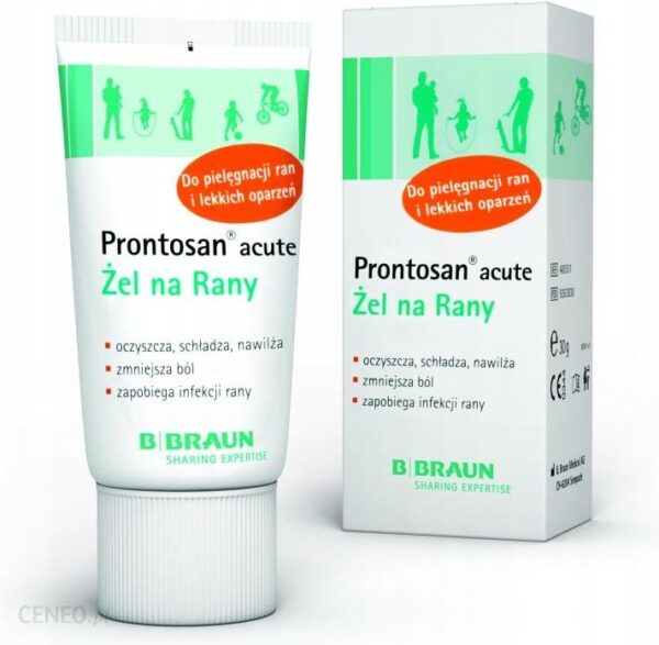 Prontosan® GelWłaściwości:Zatosowanie: –nietoksyczny dla tkanek-niedrażniący, nieuczulający-bezbolesny -przyspiesza proces powstawania ziarniny oraz nabłonka-produkt jałowy-zapewnia skuteczną barierę bakteriologiczną-skuteczny przez 8 tygodni od otwarcia opakowania-skutecznie nawilża ranę-brak systematycznej resorpcji poliheksanidyny z ran-usuwa nekrotyczne martwicze zmiany w ranie-usuwa nieprzyjemny zapach z rany-możliwość pozostawienia opatrunku z Prontosan Gel do kilku dni-może być stosowany w czasie ciąży i laktacji-zastosowanie we wszystkich rodzajach ran m.in. ostrych, przewlekłych, stopy-cukrzycowej, oparzeniach, odleżynach-skutecznie usuwa biofilm i zapobiega jego powstaniu-certyfikat DEKRA – potwierdza skuteczność preparatu wobec biofilmu-zapobiega wtórnej infekcjiZatosowanie: -Ranę przepłukać i oczyścić roztworem do płukania ran Prontosan®.-Powoduje to rozluźnienie istniejących warstw rany i ich usunięcie przedwdrożeniem leczenia z zastosowaniem preparatu Prontosan® Gel -Jeśli istnieje podejrzenie, że rana jest zainfekowana należy przemyć ranęantyseptykiem Braunol-Powierzchnie rany należy zawsze pokryć żelem o grubości co najmniej 3-5 mm. -Prontosan® Gel należy rozsmarować na powierzchni rany albo wypełnić nim istniejące jamy lub zagłębienia rany.-Opatrunki, gazy, okłady i inne materiały chłonne lub środki wypełniające ranęmożna również nawilżyć, a następnie przykryć nimi ranę lub ją wypełnićprzed założeniem właściwego opatrunku.-Prontosan® Gel może pozostać w ranie do momentukolejnej zmiany opatrunku. W zależności od tego, kiedy zaplanowana jestkolejna zmiana, codziennie lub co kilka dni.W ten sposób powierzchnia rany jest stale nawilżona, co zapewnia jej właściweoczyszczanie. Warstwy pokrywające ranę są delikatnie uwalniane i usuwane wczasie kolejnej zmiany opatrunku. Żele należy stosować tak często, aby wszystkiewarstwy oraz zmiany martwicze mogły być łatwo usunięte. Stwarza to dobrewarunki do prawidłowego gojenia rany i umożliwia chirurgiczne oczyszczanierany, zapewniając optymalną widoczność .Oczyszczanie rany:Aby zmniejszyć ryzyko przeniesienia drobnoustrojów do wnętrza rany, dooczyszczania dużych powierzchni wokół rany zaleca się stosowanie roztworu dopłukania ran Prontosan®. Jeżeli jest to konieczne, należy odkazić części ciała lubnawet całą powierzchnię z zastosowaniem odpowiednich produktów np. Braunollub Braunovidon.Czym jest biofilm?Biofilm – to trójwymiarowa kolonia bakterii zawartych w macierzyzewnątrzkomórkowych polimerów. Tworzona jest przez wiele drobnoustrojówchorobotwórczych w celu zwiększenia ochrony przed działaniem czynnikówzewnętrznych. Biofilm ma udział w patogenezie chorób przewlekłych, zwłaszczazakażeń towarzyszących stosowaniu cewników, drenów, zakładaniu implantów.Stanowi poważny problem w zakażeniach wewnątrzszpitalnych.Złożona struktura biofilmu i odmienne cechy fizjologiczne drobnoustrojów gotworzących, tłumaczą ich wysoką oporność na działanie różnych czynnikówbakteriobójczych, w tym oporność na antybiotyki. Zwarta struktura biofilmu jestbardzo trudna do zlikwidowania . Specjalistyczna linia produktów Prontosanzostała stworzona w celu usuwania oraz zapobiegania akumulacji materiimikrobiologicznej na powierzchni rany.