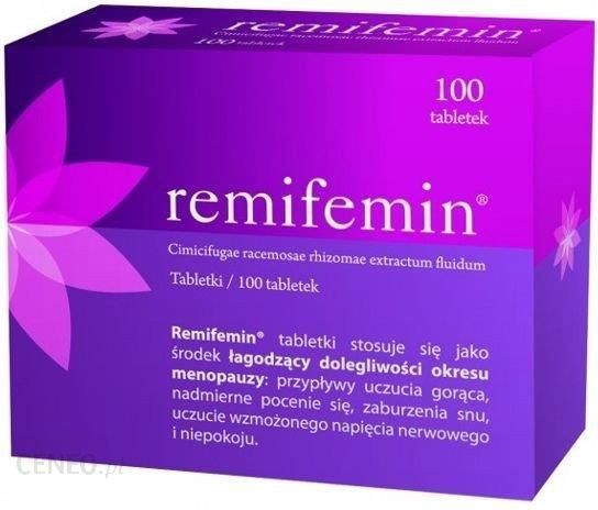Skład 1 tabl.Remifemin zawiera: 0,018-0,026 ml wyciągu płynnego Cimicifuga racemosa Działanielek łagodzi dolegliwości występujące w okresie menopauzy takie jak: uderzenia gorąca, nadmierne pocenie się, zaburzenia snu, stany napięcia i niepokoju. Sposób użycia: Remifemin stosuje się 2 razy dziennie (rano i wieczorem) po jednej tabletce, popijając niewielką ilością płynu.