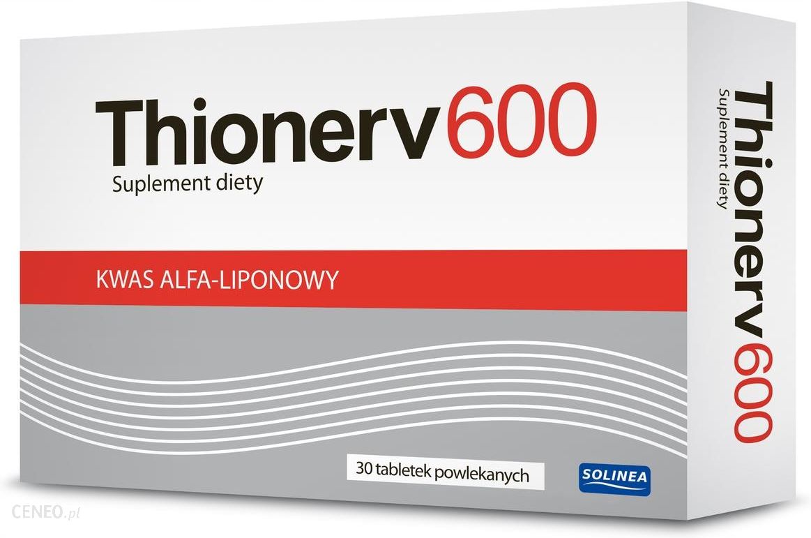 Suplement diety Thionerv 600 do zastosowania w celu uzupełnienia diety w kwas alfa-liponowy, który przyczynia się do utrzymania zdrowego poziomu glukozy we krwi oraz przyczyniać się do utrzymania prawidłowego poziomu cholesterolu. Kwas alfa-liponowy pomaga chronić układ nerwowy, oraz wspiera obniżenie poziomu cukru we krwi.Zastosowanie: uzupełnienie diety w kwas alfa-liponowy.Zalecane spożycie: 1 tabletka dziennie. Tabletkę należy popić odpowiednią ilością wody.Składniki: kwas alfa-liponowy, substancja wypełniająca: celuloza (mikrokrystaliczna), substancja przeciwzbrylająca: dwutlenek krzemu, substancje wypełniające: hydroksypropyloceluloza, sól sodowa karboksymetylocelulozy usieciowana, substancje glazurujące: hydroksypropylometyloceluloza, celuloza (mikrokrystaliczna), kwasy tłuszczowe, substancja przeciwzbrylająca: sole magnezowe kwasów tłuszczowych, tłuszcz palmowy całkowicie uwodorniony, barwnik: dwutlenek tytanu.1 tabletka zawiera: kwas alfa-liponowy 600mg.Przeciwwskazania: produkt nie jest przeznaczony dla dzieci poniżej 3 roku życia. Nie zaleca się kobietom w ciąży i karmiącym piersią.Ważne wskazówki:Przechowywać w suchym i ciemnym miejscu w temperaturze do 25 stopni Celsjusza.Suplement należy przechowywać w sposób niedostępny dla dzieci.Ważne jest stosowanie zbilansowanej i zróżnicowanej diety oraz prowadzenie zdrowego tryby życia.Preparat nie może być stosowany jako substytut zróżnicowanej diety.Nie należy przekraczać zalecanej porcji dziennej.