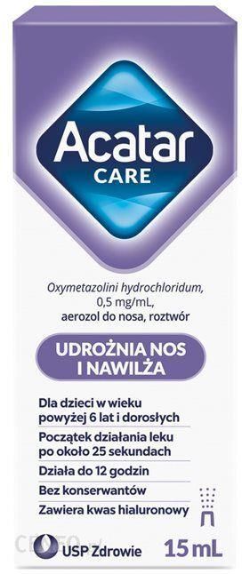 Acatar Care aerozol do nosa to lek dostępny bez recepty do podawania donosowego. Substancją aktywną w preparacie jest chlorowodorek oksymetazoliny, który powoduje obkurczenie naczyń krwionośnych oraz zmniejsza obrzęk błon śluzowych. Produkt leczniczy stosowany jest m.in. w ostrym i alergicznym zapaleniu błony śluzowej nosa, zapaleniu zatok oraz ucha środkowego. Aerozol do nosa Acatar Care zmniejsza katar i tym samym ułatwia oddychanie przez nos.
