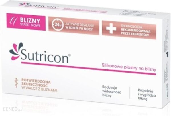 WskazaniaPlastry silikonowe na blizny Sutricon przeznaczone są do:blizn pooperacyjnychblizn poparzeniowychblizn po cesarskim cięciublizn pourazowychw zapobieganiu nieprawidłowemu bliznowaceniudla dzieci (już od 6. miesiąca życia) i dorosłychw zmniejszeniu widoczności blizn świeżych i dojrzałych (nawet do 9 lat)Plastry Sutricon – stosowaniePlastry silikonowe mogą być używane zarówno przez dzieci (od 6 miesiąca życia) jak i dorosłych. Przy stosowaniu plastrów należy przede wszystkim dopasować ich wielkość, odpowiednio docinając plaster do wielkości blizny pozostawiając 5 mm margines z każdej strony. Ważna jest także regularna wymiana plastrów. Jeden plaster może być stosowany od 3 do 5 dni, przy codziennym zdjęciu plastra, przemyciu blizny, dokładnym osuszeniu a następnie ponownym naklejeniu tego samego plastra.Należy pamiętać, że długość terapii jest zależna od wielu czynników indywidualnych, jednak są to minimum 3 miesiące przy świeżych bliznach, a przy bliznach starszych nawet powyżej pół roku stosowania plastrów.Działanie silikonowych plastrów SutriconPlaster silikonowy Sutricon skutecznie poprawia wygląd i elastyczność blizn. Innowacyjna struktura, zawierająca wysokiej jakości farmaceutyczny żel silikonowy, posiada właściwości zbliżone do zdrowej ludzkiej skóry: elastyczność, przepuszczalność tlenu i zapobieganie procesowi nadmiernej transepidermalnej utracie wody. Dzięki tym cechom plastry silikonowe na blizny redukują dyskomfort związany z blizną, taki jak ból, swędzenie czy uczucie ciągnięciaZalety plastrów silikonowych SutriconEfektywne w leczeniu zarówno świeżych, jak i dojrzałych blizn, nawet 9 letnichZmniejszają bliznę i poprawiają jej wyglądPlastry silikonowe posiadają rekomendację Międzynarodowego Zespołu Ekspertów ds. Leczenia Blizn[5]Są wygodne w stosowaniu – w przeciwieństwie do maści nie brudzą ubrań, nie są tłuste i kleistePlastry na blizny Sutricon są ultracienkie (0,25 mm) oraz przezroczyste, dzięki czemu są prawie niewidoczne na skórzeDzięki swojej elastyczności dopasowują się do anatomicznych kształtów ciałaCharakteryzują się doskonałą adhezyjnością (przyczepnością), dzięki czemu możliwa jest wielokrotna aplikacjaPlastry Sutricon posiadają półprzepuszczalną membranę, dzięki czemu pozwalają oddychać skórzePlastry silikonowe mogą być stosowane nawet przez alergików, na wszystkie obszary skóry, także te wrażliweCzas terapii plastrami SutriconWażną kwestią jest czas terapii, czyli jak długo należy stosować plastry Sutricon. Efekty można zaobserwować już po miesiącu, jednak pełna kuracja jest dłuższa i zależy od wielu czynników indywidualnych. Najważniejsze to wielkość i rodzaj blizny, a także uwarunkowania genetyczne. Blizny najszybciej goją się u dzieci, natomiast u osób starszych czas potrzebny na pełną regenerację skóry jest najdłuższy. Aby osiągnąć zadowalające efekty, należy stosować preparat regularnie i postępować zgodnie z instrukcją używania. Długość terapii to średnio:min. 3 miesiące w przypadku blizn świeżychmin. 6 miesięcy w przypadku blizn starszychPrzy skłonnościach do nieprawidłowego bliznowacenia, np. keloidów czy bliznowców zaleca się stosowanie plastrów Sutricon przez cały okres przebudowy blizny, nawet do 1 roku.Składniki plastrów SutriconŻel silikonowy, elastyczna membrana poliuretanowa.Jak używać plastrów SutriconPrzed pierwszym użyciem należy dokładnie zapoznać się z treścią dołączonej do opakowania ulotki, ponieważ powodzenie terapii zależy od prawidłowego stosowania preparatu Sutricon. Plaster można używać po całkowitym zagojeniu rany i po zdjęciu szwów. Przed użyciem należy dokładnie oczyścić i osuszyć bliznę. W celu dopasowania wielkości plastra do powierzchni blizny, możliwe jest jego docięcie w dowolny sposób. Plastry silikonowe na blizny należy zmieniać średnio co 3 do 5 dni, jednak najlepsze efekty uzyskuje się wymieniając je co 24 godziny.Docinamy na wymiarPlaster silikonowy należy dociąć do wielkości blizny, z uwzględnieniem 5 mm marginesu z każdej strony.Dzielimy na częściPrzy bliźnie o rozmiarach 0,5 x 13 cm z jednego, dużego opakowania można uzyskać 30 mniejszych plastrów.24h aktywnego działaniaAktywne działanie przez cały dzień. Plastry silikonowe na blizny Sutricon można nosić przez całą dobę. Jednak przynajmniej raz na dobę należy je zdjąć, bliznę umyć neutralnym mydłem, wysuszyć i nałożyć ten sam plaster ponownie.1 plaster = 3-5 dniJeden plaster Sutricon można nosić do 5 dni, jeśli jest zachowany w czystości oraz utrzymuje właściwości adhezyjne. Uwaga! Plastra nie należy myć ani zaklejać dodatkowym opatrunkiem.1-3 miesięcy terapiiJedno opakowanie wystarcza na 1-3 miesiące terapii, w zależności od wielkości i rodzaju blizny.PKWIU 21.20.24.0Rodzaj Wyrób medyczny innyEAN 5906716507602BLOZ_07 9053879