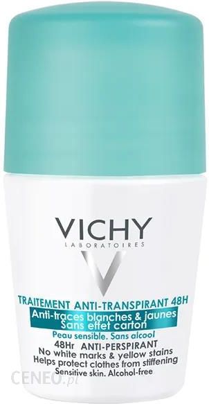 Vichy Antyperspirant Roll-On Anti-TraceHipoalergiczny. Nie zawiera Parabenów. Testowany pod kontrolą dermatologiczną na skórze wrażliwej. Testowany dermatologicznie, hipoalergicznie i na skórze wrażliwej. Antyperspirant jest skuteczny przez 48 godzin, czysta redukcja procesu żółknięcia materiałów i powstawaniu plam. Brak białych plam na ciemnych ubraniach. Dezodorant daje skórze poczucie świeżości i miękkości bez białych śladów lub uczucia dyskomfortu. Po zastosowaniu na skórze pozostawia lekką, pudrową warstwę bez uczucia lepkości. Gwarantowany brak śladów na skórze lub ubraniu.