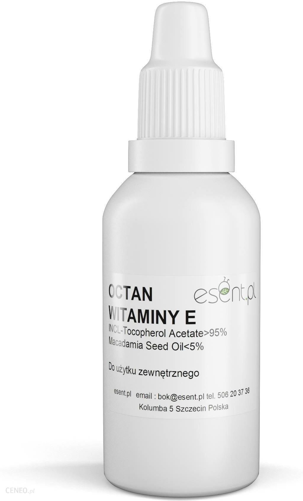 ESENTWitamina E Octan witaminy E 30ml Octan witaminy E (octan tokoferylu) – jest to forma witaminy E najczęściej stosowana w kosmetyce, jest rewelacyjnym antyoksydantem, neutralizuje i likwiduje obecne w skórze wolne rodniki, poprzez to hamuje procesy starzenia się skóry, wzmacnia i odżywia barierę lipidowa skóry, regulując poziom wody w skórze, podwyższa zdolność wiązania wody przez skórę. Kolejnym bardzo pożądanym działaniem witaminy jest ochrona skóry przed działaniem promieni UV, a także łagodzenie skutków oparzeń słonecznych. Nie można nie wspomnieć o działaniach typowo dermatologicznych, witamina E, przyspiesza gojenie się ran, ma działanie przeciwzapalne. Jest doskonałym naturalnym konserwantem zapewniającym stabilność preparatu kosmetycznego.Zastosowanie:Stosowana jest powszechnie w niemal wszystkich kosmetykach pielęgnacyjnych, począwszy od kremów balsamów odmładzająco – nawilżających, poprzez produkty do ochrony przed promieniami słonecznymi, skończywszy na środkach dermatologicznych wspomagających gojenie się ran, czy łagodzących skutki oparzeń (także słonecznych). Sugerowane stężenie w kosmetykach do 5%, octan witaminy znakomicie rozpuszcza się w tłuszczach (olejach, masłach kosmetycznych itp.), nie rozpuszcza się w wodzie.Informacje chemiczne:Ester kwasu octowego i witaminy E (tokoferylu). Jest witaminowym suplementem stosowanym w produktach dermatologicznych, w stosunku do czystego tekoferolu ma zblokowana grupę hydroksylową co przekłada się no podwyższenie ph ( zmniejszenie kwasowości). Octan w kontakcie ze skórą powoli hydrolizuje i jest wchłaniany przez skórę.Postać : oleista ciecz Kolor: bezbarwny do słomkowego Zapach: swoisty Wartość pH: brak Temperatura topnienia: 2,5 – 3,5 °C Temperatura wrzenia: 184 °C Temperatura zapłonu: 259 °C Temperatura samozapłonu: brak Rozpuszczalność: w wodzie – 0,05 mg/l w 20 °C