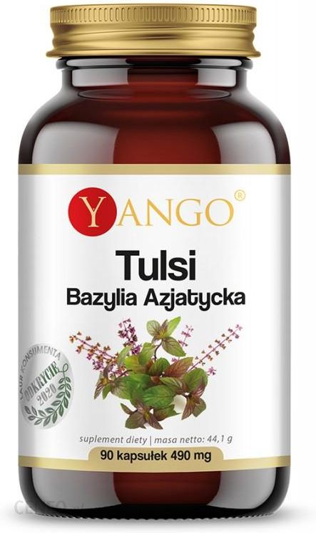 Yango Tulsi Bazylia Azjatycka 90 kapsułekTulsi inaczej zwane jest bazylią azjatycką lub świętą bazylią. Pomaga zachować optymalne zdrowie psychiczne i fizyczne. Wspiera organizm podczas sytuacji stresowych oraz utrzymuje odpowiedni poziom witalności. Zawiera naturalne przeciwutleniacze, które chronią przed szkodliwym działaniem wolnych rodników. Tulsi wpływa na korzystne funkcjonowanie układu oddechowego.Wsparcie zdrowia psychicznego3 miesiące naturalnej suplementacjiBez dodatków i wypełniaczyKapsułki z celulozy roślinnej, delikatne dla żołądka, przyjazne wegetarianom i weganom