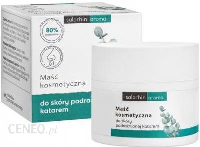 SALORHIN AROMAmaść kosmetyczna do skóry podrażnionej kataremMaść kosmetyczna do skóry podrażnionej katarem dla dorosłych oraz dzieci od 1. roku życia.Opis:Salorhin aroma maść kosmetyczna przeznaczona do smarowania zaczerwienionej skóry nosa, polecana dla dorosłych oraz dzieci od 1. roku życia. Maść może być stosowana przez osoby o skórze wrażliwej i skłonnej do podrażnień. Naturalne olejki eteryczne zawarte w maści (sosnowy, eukaliptusowy, majerankowy, lawendowy) wykazują działanie aromaterapeutyczne. Masło shea, pantenol i alantoina regenerują, nawilżają i natłuszczają skórę, wspomagając proces jej odnowy. Tworzą warstwę ochronną zabezpieczając nos przed dalszymi podrażnieniami.Składniki aktywne: olejek sosnowy, olejek eukaliptusowy, olejek majerankowy, olejek lawendowy, masło shea, pantenol, alantoina.80% składników pochodzenia naturalnegoSposób użycia: niewielką ilość produktu rozprowadzić na podrażnionej skórze w obrębie nosa. Czynność powtarzać kilka razy dziennie, w zależności od potrzeb.Pojemność: 15 mlSkład:Ingredients: Butyrospermum Parkii Butter, Zinc Oxide, Panthenol, Glycerin, Aluminum Starch Octenylsuccinate, Origanum Majorana Herb Oil, Calcium Carbonate, Allantoin, Pinus Sylvestris Leaf Oil, , Eucalyptus Globulus Leaf Oil, Caprylic/Capric Triglyceride, Lavandula Angustifolia Oil, Retinyl Palmitate.